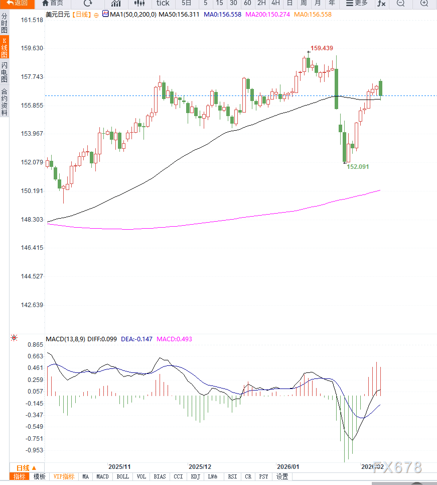 从日线结构来看,USD/JPY在两周高点157.65回落后,开始在关键均线附近企稳,显示多空双方仍在均衡博弈。